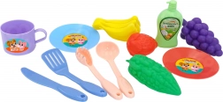 Tanjuri, šalica, pribor za jelo, voće i povrće te bočica za “detergent” – sve što malom pomagaču u kuhinji treba.