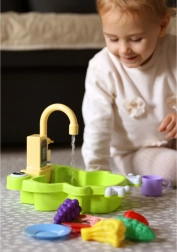 Nakon punjenja sudopera i uključivanja slavine voda počinje kružiti – djeca mogu “prati” voće i posuđe kao odrasli.