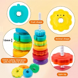 - Set sadrži šest prstenova različitih oblika, koje se mogu složiti jedan na drugi i formirati šarenu, rotirajuću piramidu