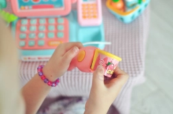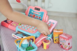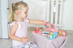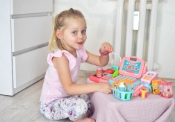 U kompletu su košarica, voće, povrće, keksi, napitci, sladoled, telefon, kovanice, novčanice i platna kartica.