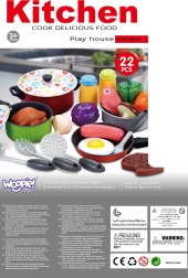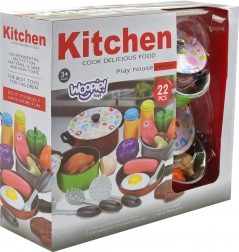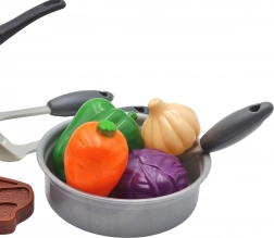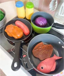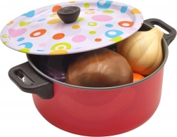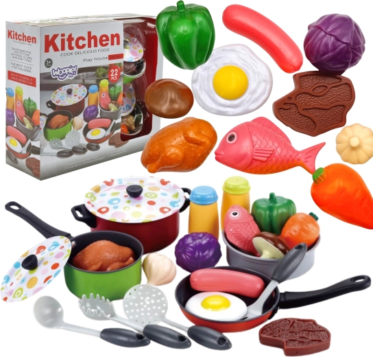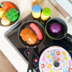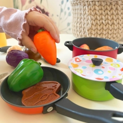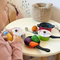 Lonci s poklopcima, tava i šarene namirnice omogućuju djeci oponašanje pravog kuhanja te razvoj mašte i fine motorike.