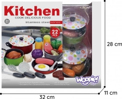 Uz set WOOPIE vaše će dijete dobiti vlastitu malu kuhinju: lonce s poklopcima, tavu, zdjelu, začine i bogat izbor namirnica od jajeta i kobasica do ribe, povrća i odreska. Zahvaljujući realističnoj izradi i živim bojama potiče maštu, finu motoriku i socijalne vještine kroz igru kuhanja.