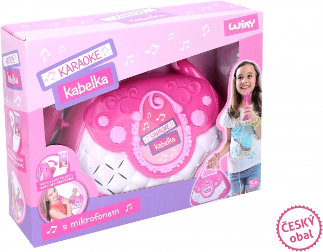 Prijenosni karaoke reproduktor u obliku torbice s mikrofonom, svjetlosnim i zvučnim efektima. Idealan za svaku zabavu. Pogodan za djecu od 3 godine.