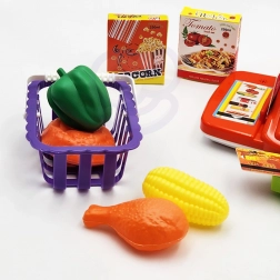 Dio seta su košarica za kupnju i plastične namirnice (povrće, voće, grickalice) koje potiču maštu i socijalne vještine.