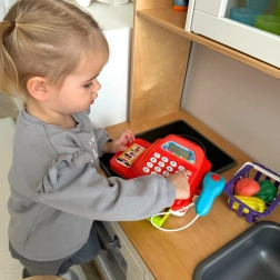 Dječja blagajna WOOPIE nudi autentično iskustvo trgovine: djeca odaberu “proizvode”, skeniraju ih ručnim skenerom sa zvukom, izračunaju cijenu na ugrađenom kalkulatoru i plate novčanicama, kovanicama ili platnom karticom. Sve se završava otvaranjem izvlačive blagajničke ladice.