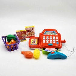 - Blagajna sa skenerom, košarica za kupnju, plastične namirnice, kovanice, novčanice, platne kartice