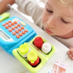 Integrirani kalkulator pomaže zbrajati kupnje, dok ladica sigurno pohranjuje kovanice i novčanice – učenje brojanja novca kroz igru.