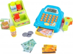 Set sadrži platnu karticu, novčanice, kovanice, kutijicu s keksima i policu s artiklima za potpunu igru trgovine.