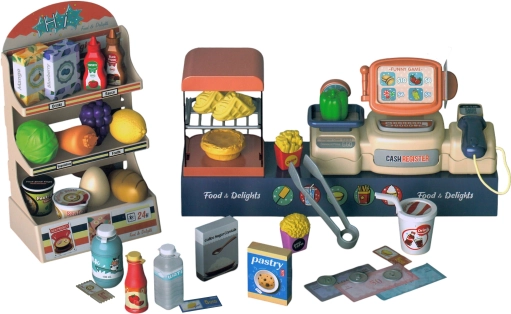 - supermarket s policom, blagajna, skener barkodova, vaga, papirnati novac, kovanice, razne namirnice (voće, povrće, napitci itd.), hvataljke za posluživanje