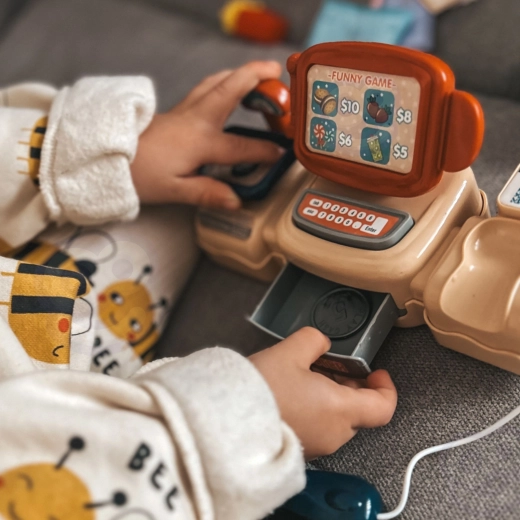 Djeca mogu „pištati” robu i čuti autentične zvukove skeniranja. Ladica za novac i tipke potiču realističnu igru i učenje o plaćanju.
