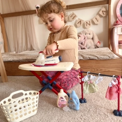 Set za glačanje za djecu marke Woopie donijet će vašem djetetu puno zabave kroz igru maliog domaćina. Sadrži glačalo, dasku za glačanje, košaru za rublje i uključujući vješalice i odjeću za lutke, sve sigurno i prilagođeno dječjim potrebama.