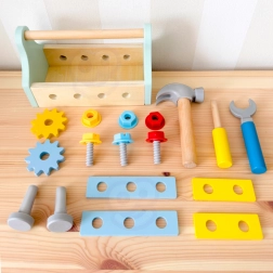 Dječji drveni set alata donosi zabavnu i edukativnu igru tijekom koje djeca iskušavaju osnovno majstorstvo. Realistični alati (čekić, odvijač i ključ), vijci, matice, zupčanici i građevne pločice mogu se zavrtati i pričvršćivati u otvore na kutiji – to potiče logičko razmišljanje i razumijevanje jednostavnih mehanizama.