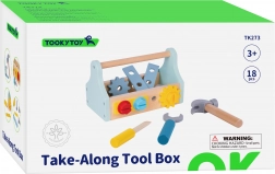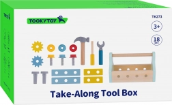 Preslatka drvena kutija s alatom marke TOOKY TOY idealna je za male majstore od 3 godine. Set sadrži 18 dijelova u pastelnim bojama – čekić, odvijač, ključ, vijke, matice, zupčanike i pločice. Dijelovi se mogu lako pričvrstiti u otvore na kutiji, a nakon igre se praktično pospremiti unutra. Izrađeno od kvalitetnog drva s netoksičnim bojama i osmišljeno za razvoj fine motorike, kreativnosti i koordinacije ruka–oko.