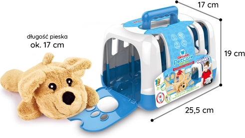 Igra veterinara jača socijalne vještine, uči odgovornosti i potiče maštu. Laka transporterkica s udobnom ručkom osigurava da djeca mogu svog psića i pribor ponijeti na put, u posjet ili na igralište.
