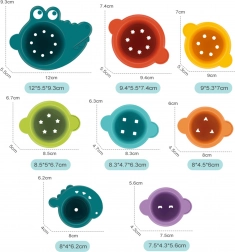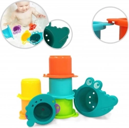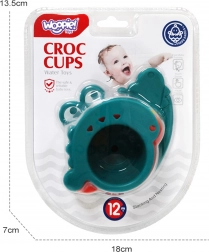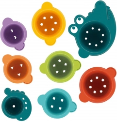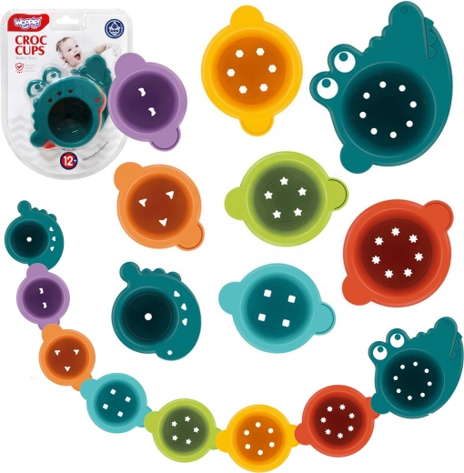 Čašice se mogu slagati jedna u drugu, graditi u visoke tornjeve ili se mogu spajati bočno u dugi „rep“. Jedna od čašica ima presladak izgled krokodila, koji kupanju daje dodatnu dozu zabave. Šareni dizajn i oblici otvora pomažu u učenju boja i geometrijskih oblika.