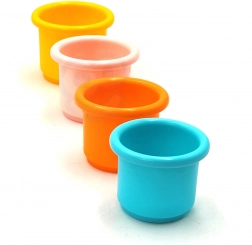 Četiri šarene čašice imaju na dnu različite otvore pa pri prelijevanju nastaju raznoliti vodeni efekti. Djeca tako prirodno uče razlikovati boje, vježbaju koordinaciju oko–ruka i razvijaju kreativnost. Izdržljivi, glatki materijali ugodni su na dodir i lako se čiste.