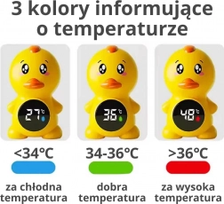 Intuitivna kolor skala: plava = manje od 34 °C, zelena = 34–36 °C, crvena = više od 36 °C. Ergonomski oblik pačića je prijateljski djeci i siguran za upotrebu u vodi. Idealan pomagač za svakodnevno kupanje i ljetne vodene igre.