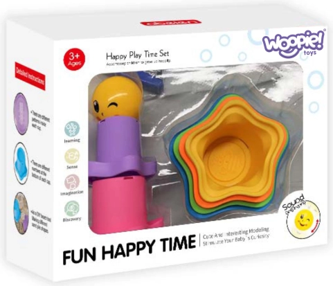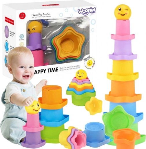 Šarena slagalica piramida WOOPIE sa čašicama u obliku zvjezdica i nasmiješenom lopticom potiče finu motoriku, koordinacijske vještine i prepoznavanje boja i oblika. Izdržljiva, sigurna i netoksična plastika, zaobljeni oblici i zaigran dizajn za radosno učenje kroz igru.