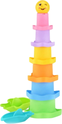 Ova senzorička piramida u bojama duge sadrži čašice različitih veličina u obliku zvjezdica i veselu lopticu s tiskom. Djeca vježbaju hvat, razvrstavanje prema veličini i logičko razmišljanje dok slažu i ruše toranj ili istražuju pojedine dijelove.