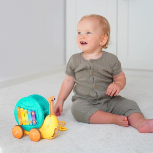 Čvrsta uzica omogućuje povlačenje puža, a kotači osiguravaju gladak pokret. Potiče prirodno kretanje i samostalnu igru.