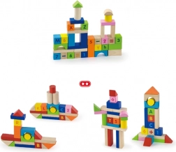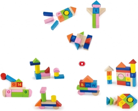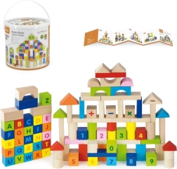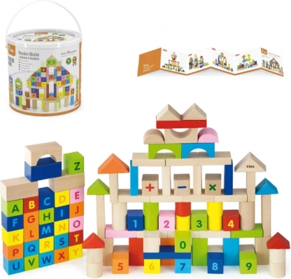 Ovaj raznobojni set od 100 drvenih kocaka VIGA, nadahnut MONTESSORI principima, donosi djeci radost otkrivanja slova, brojeva i jednostavnih računskih zadataka. Zahvaljujući različitim oblicima – kocke, valjci, lukovi i krovovi – djeca mogu graditi gradove, tornjeve i maštovite građevine, a usput nenametljivo vježbati abecedu, računanje i boje.
