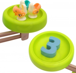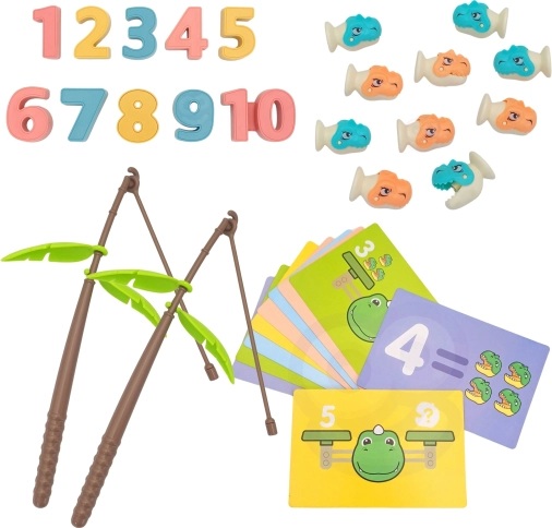 Nakon učenja slijedi zabava: magnetni štapovi s listovima pretvaraju set u igru pecanja dinosaura/ribica, koja razvija koordinacijske sposobnosti, strpljenje i finu motoriku. Čvrsta baza s simpatičnim dinosaurom osigurava stabilnost i sigurno igranje.