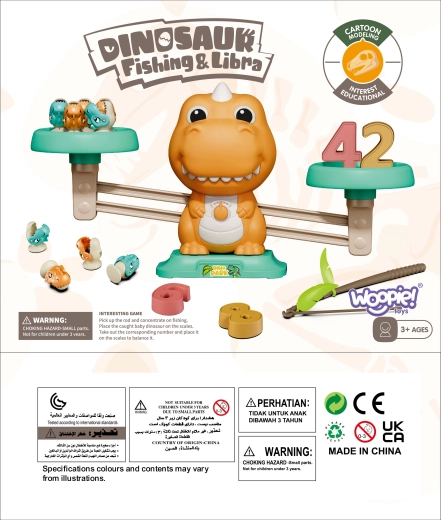 Zabavni edukativni set WOOPIE spaja dinosaurus vagu za ravnotežu i igru pecanja ribica/dinosaura. Djeca kroz igru uvježbavaju brojanje 1–10, osnove jednadžbi i finu motoriku uz brojčane utege, kartice sa zadacima i magnetne štapove. Idealna aktivnost za predškolce od 3 godine.