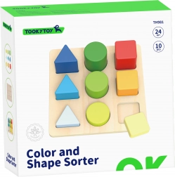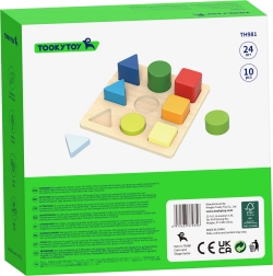 Drvena slagalica brenda TOOKY TOY uči djecu prepoznavati oblike i boje te razvija finu motoriku, logičko razmišljanje i koordinaciju ruka–oko. Dijete umeće 9 obojenih dijelova – trokute, kvadrate i krugove – u odgovarajuće otvore na ploči. Sjajna zabava i trening pamćenja i koncentracije za najmlađe.