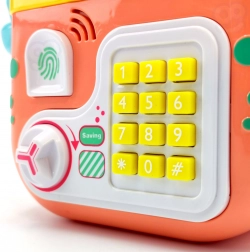 Pohranjujte kovanice i novčanice kroz zasebne otvore, postavite lozinku i otvorite pomoću okretnog kotačića. Idealno za prve korake financijske pismenosti.