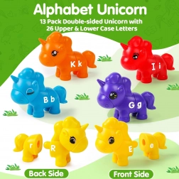 Set šarenih jednoroga dizajniran je da pruži sate beskrajne i edukativne zabave. Pomoću ovih igračaka djeca mogu učiti abecedu spajanjem dijelova označenih slovima.