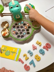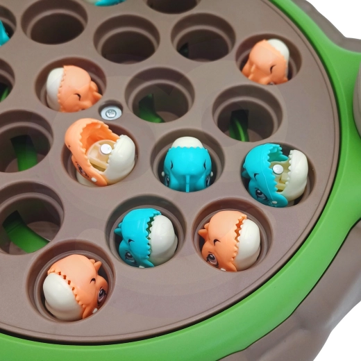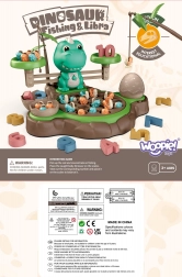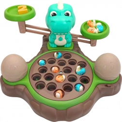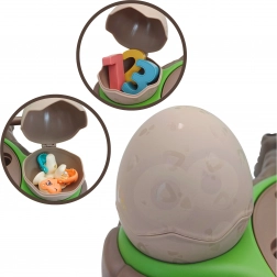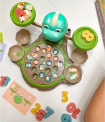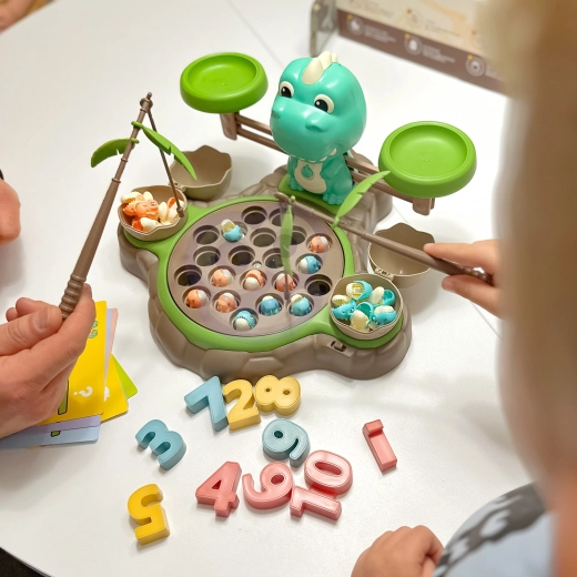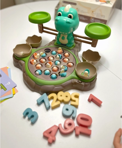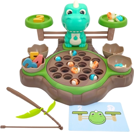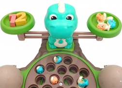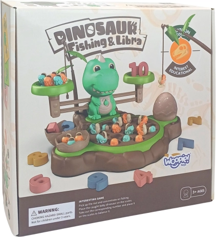 Igračka Dinosaur s vagom od WOOPIE nudi djeci mogućnost istraživanja svijeta brojeva i matematičkih operacija tijekom zabavne igre hvatanja dinosaura. Na postolju se nalazi okretni tanjur s kojeg se mogu hvatati mali dinosauri. Prekidačem se tanjur počinje okretati, a melodija prati djecu tijekom igre. Iza tanjura je smješten veliki dinosaurus koji služi kao vaga te mjesto za štapove za hvatanje, koje se mogu ukrasiti listićima iz seta. Sa strane se nalaze dvije zatvorive ljuske jaja za pohranu ulovljenih dinosaura.