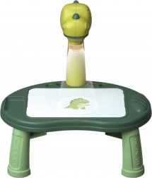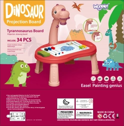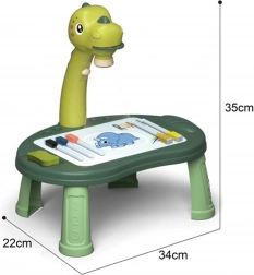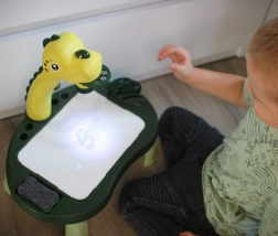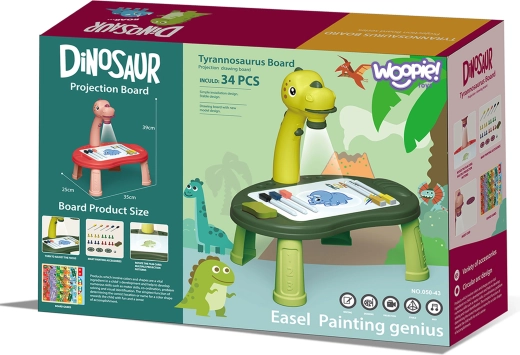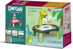 Dječji projekcijski stolić u obliku dinosaura marke WOOPIE projicira slike na površinu za lako precrtavanje. Sadrži projektor, 24 predloška (3 diska), ploču za suho brisanje, 5 flomastera i 2 društvene igre (Čovječe, ne ljuti se! i Zmije i ljestve). Idealan za razvoj kreativnosti i fine motorike djece od 3 godine.
