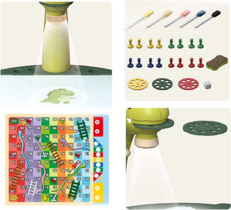 Stolić je lagan, kompaktan i prijenosan – idealan za dječju sobu i za putovanja. Projektor se lako upravlja i napaja se s 3× AA 1,5 V baterijama (nisu uključene). Osim crtanja, djecu će razveseliti i 2 društvene igre u pakiranju: Čovječe, ne ljuti se! i Zmije i ljestve s kockom i figurama.