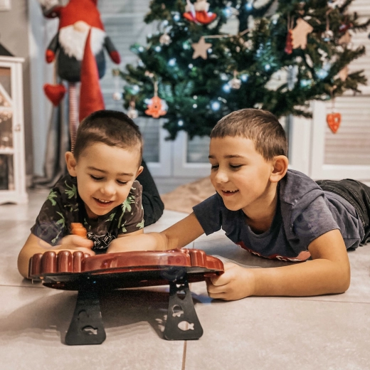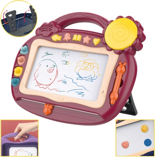 Zahvaljujući praktičnom ručnom držaču ploča se lako prenosi na putovanja i u vrtić, a sklopive nožice osiguravaju udobno pisanje za stolom. U komplet su uključeni magnetsko pero i 4 žiga, koji potiču djecu na stvaranje i poboljšavaju njihovu finu motoriku.