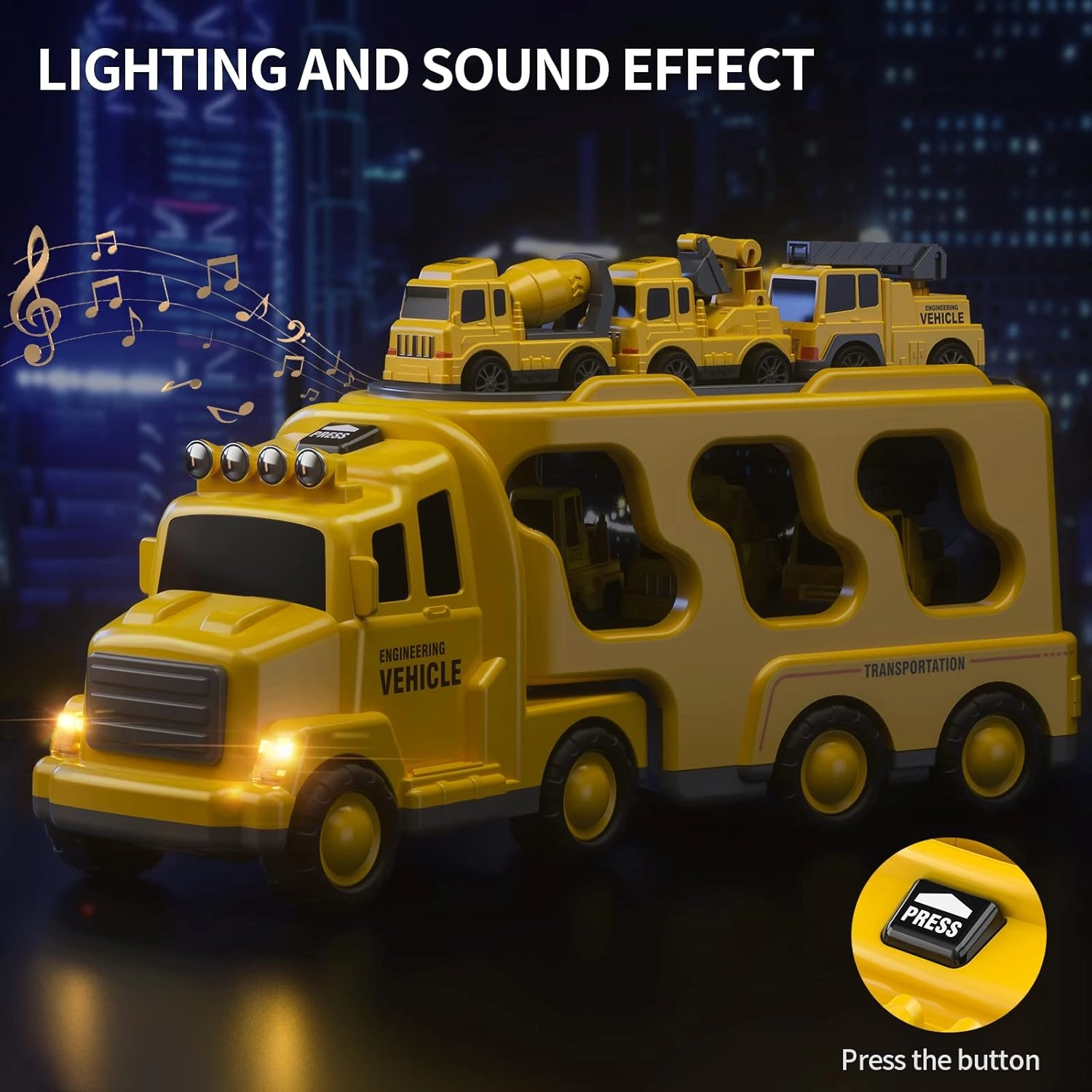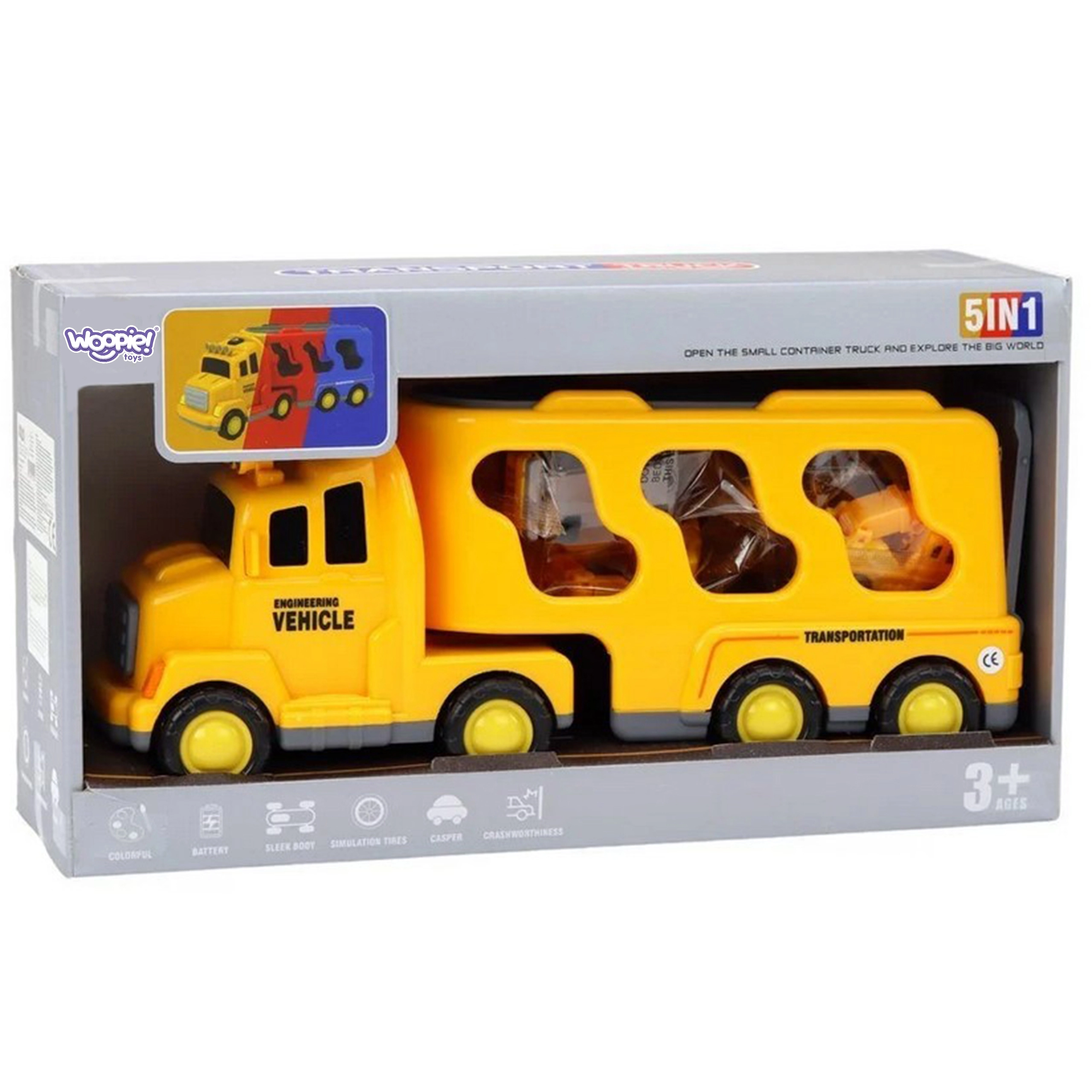 Otkrijte šarolik svijet cestovne pomoći i gradilišta sa setom WOOPIE. Velika žuta transportna garnitura preveze i pohrani sva manja autića – bager, mješalicu, dizalicu i buldožer. Zahvaljujući inercijskom pogonu manji strojevi pokreću se jednostavnim guranjem, a svjetla i zvukovi pružaju realističan doživljaj.