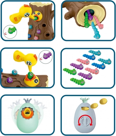 Pomoću magnetnih kljunova djeca hvataju crviće i hrane ptića. Vježbaju preciznost, hvat i koordinaciju oko–ruka na zabavan način.
