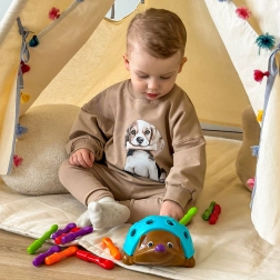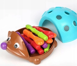 Ova edukativna igračka idealna je za prvo učenje kroz igru. Veliki ergonomski dijelovi savršeno pristaju malim ručicama, a izrazite boje potiču na sortiranje i stvaranje jednostavnih nizova. Numerirana školjka podupire rano brojanje i razlikovanje boja, dok umetanje bodlji vježba finu motoriku i strpljenje.