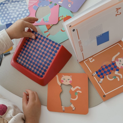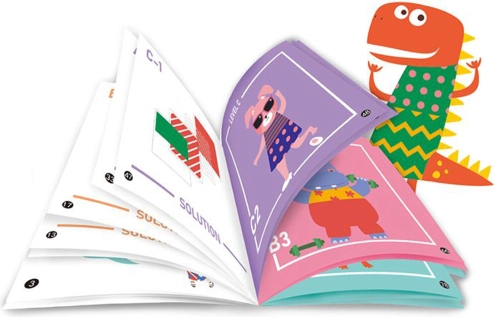 Set uključuje stabilno postolje, četiri predloška likova te raznobojan izbor karata s uzorcima i knjižicu sa zadacima i rješenjima. Igra lijepo razvija prostornu percepciju, finu motoriku i vizualnu percepciju oblika, boja i uzoraka. Odlično kao edukativni poklon za predškolce.