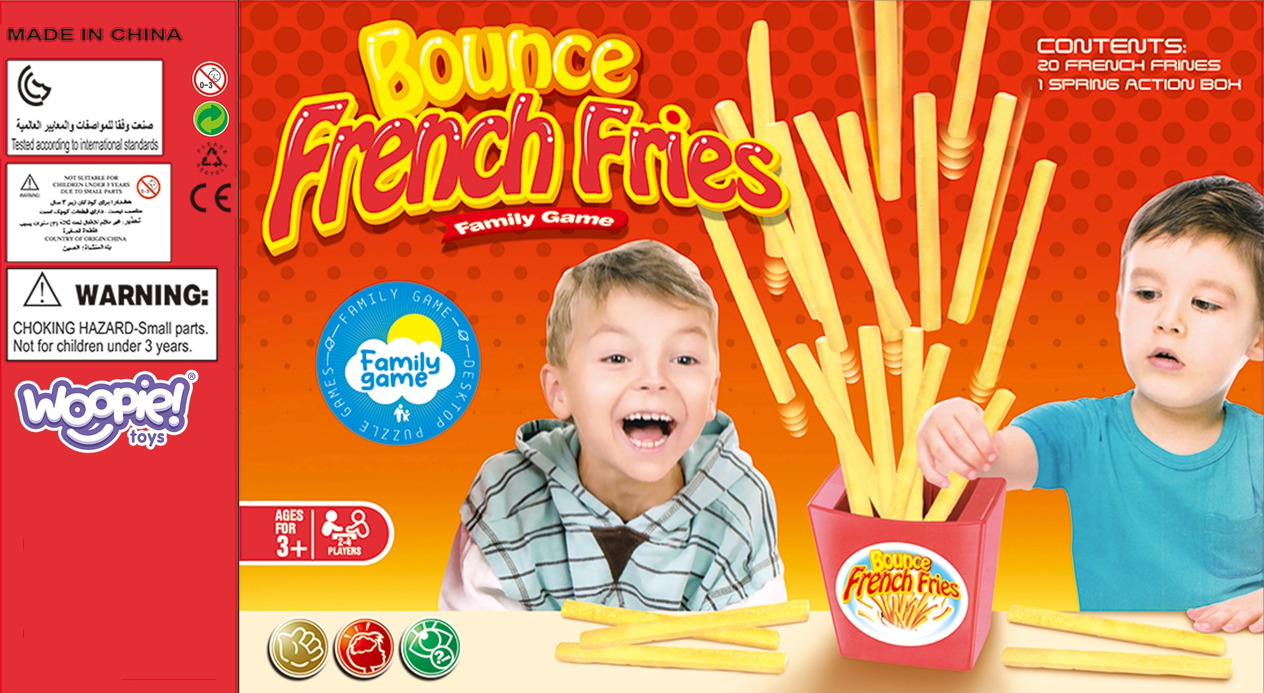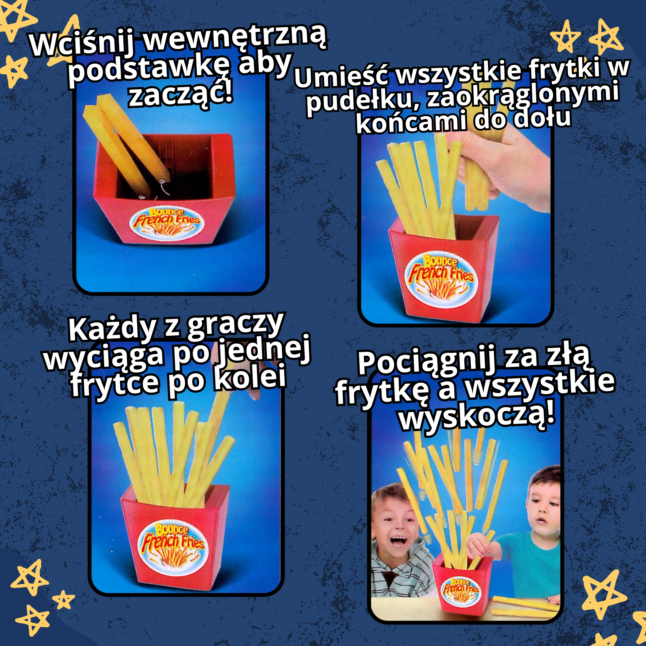 Igra Skakajući pomfrit od WOOPIE je brza i zarazna party igra za djecu i odrasle. Cilj je pažljivo izvlačiti pomfrit iz čašice i ne izazvati njihov “eksplozivni” skok. Lagana, kompaktna i odmah razumljiva – idealna za zajedničke večeri s obitelji ili prijateljima.