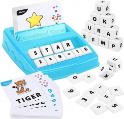 Set uključuje plavi plastični stalak s pločicama za slova i brojeve koje omogućuju stvaranje riječi i rješavanje jednadžbi.