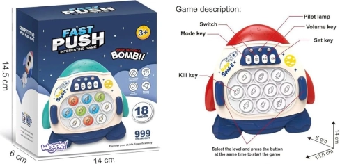 Elektronička igra WOOPIE Pop It Raketa donosi djeci od 3 godine mnogo interaktivne zabave i osjetilne stimulacije. Zahvaljujući svjetlosnim i zvučnim efektima potiče na dulju igru, razvija finu motoriku, koordinaciju oko–ruka i pomaže ublažiti stres. Čvrsta i sigurna izrada od izdržljivog materijala osigurava dug vijek trajanja.
