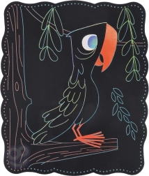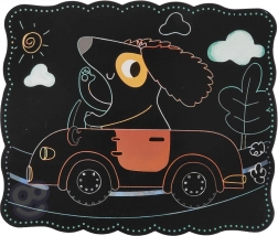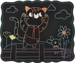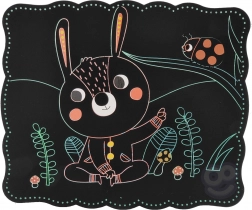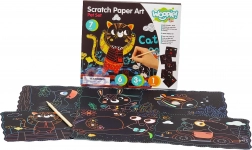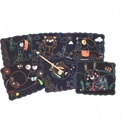 U pakiranju se nalazi 6 kartica za grebanje sa životinjama – mačka, pas, puž, zec, ribica i papiga – te drveni stilus. Zahvaljujući praktičnoj kutiji sa zatvaranjem, set je lako ponijeti u auto, restoran ili na odmor. Aktivnost potiče finu motoriku, strpljenje i kreativnost.