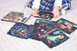 Šest različitih kartica s mačkom, psom, pužem, zecom, ribicom i papigom potiče djecu na stvaranje i otkrivanje skrivenih boja.