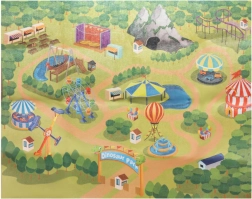 Dio seta je filcana podloga s motivom parka dinosaura koja stvara pregledno i tematsko okruženje za priče.