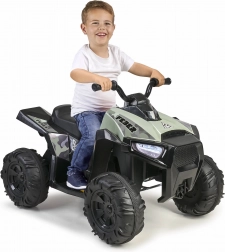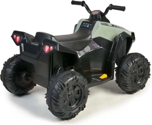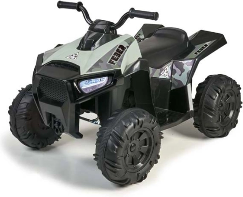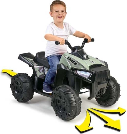 Prekrasan dječji električni kvad španjolske marke Feber. Kamuflažna boja daje terenski izgled. Kvad je opremljen velikim, izdržljivim kotačima za bolji grip, a rad mu je tih, bez oštećivanja podova.