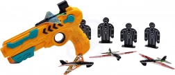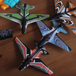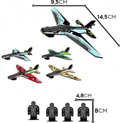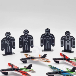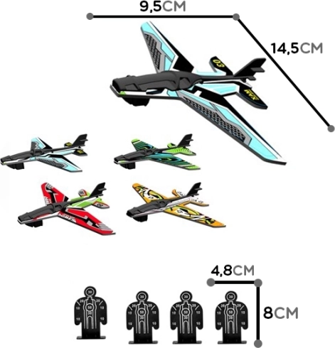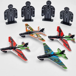 U pakiranju se nalazi 4 šarena pjenasta aviona i 4 mete za natjecateljsku zabavu. Djeca pritom prirodno vježbaju koordinaciju oko–ruka, procjenu udaljenosti i preciznost. Šarena poklon-ambalaža čini ga odličnom idejom za dar.