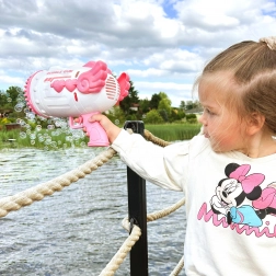 Zahvaljujući promišljenom mehanizmu pištolj ravnomjerno raspoređuje otopinu u sve otvore i osigurava bogat efekt mjehurića. Praktična podloška za otopinu olakšava uranjanje nastavka. U kompletu je i akumulator s USB punjenjem te 2 punjenja, kako biste mogli početi odmah po vađenju iz kutije.