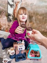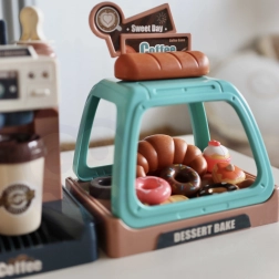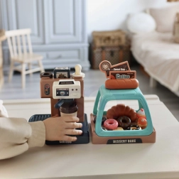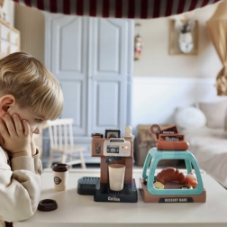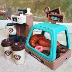 Set dječje kavane WOOPIE nudi autentičan doživljaj pripreme kave – dovoljno je uliti vodu u spremnik, staviti ručicu, prisloniti čašu i „kava” je gotova. Prilikom mljevenja i kuhanja čuju se realistični zvukovi, treperi crveno svjetlo, a po završetku se upali zelena lampica sa zvučnim signalom. Vitrina s donutima, kroasanima i drugim slasticama upotpunjuje atmosferu male pekarnice.