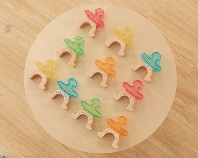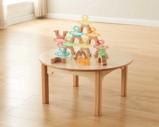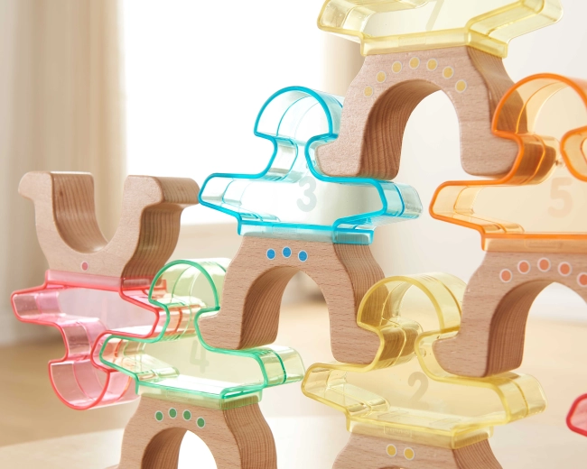 Prozirni obojeni elementi u kombinaciji s prirodnim drvom potiču maštu. Figurice se mogu slagati u piramide, vlakiće i originalne oblike.