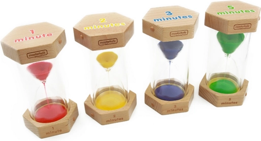 Set pješčanih satova MASTERKIDZ idealno je didaktičko pomagalo za vrtiće, škole i učenje kod kuće. Četiri sata s različitim vremenom protoka jasno pokazuju djeci kako vrijeme prolazi i pomažu razumjeti osnovne pojmove poput sekundi i minuta. Obojeni pijesak i jednostavno funkcioniranje potiču samostalnost i prirodno poimanje vremena.